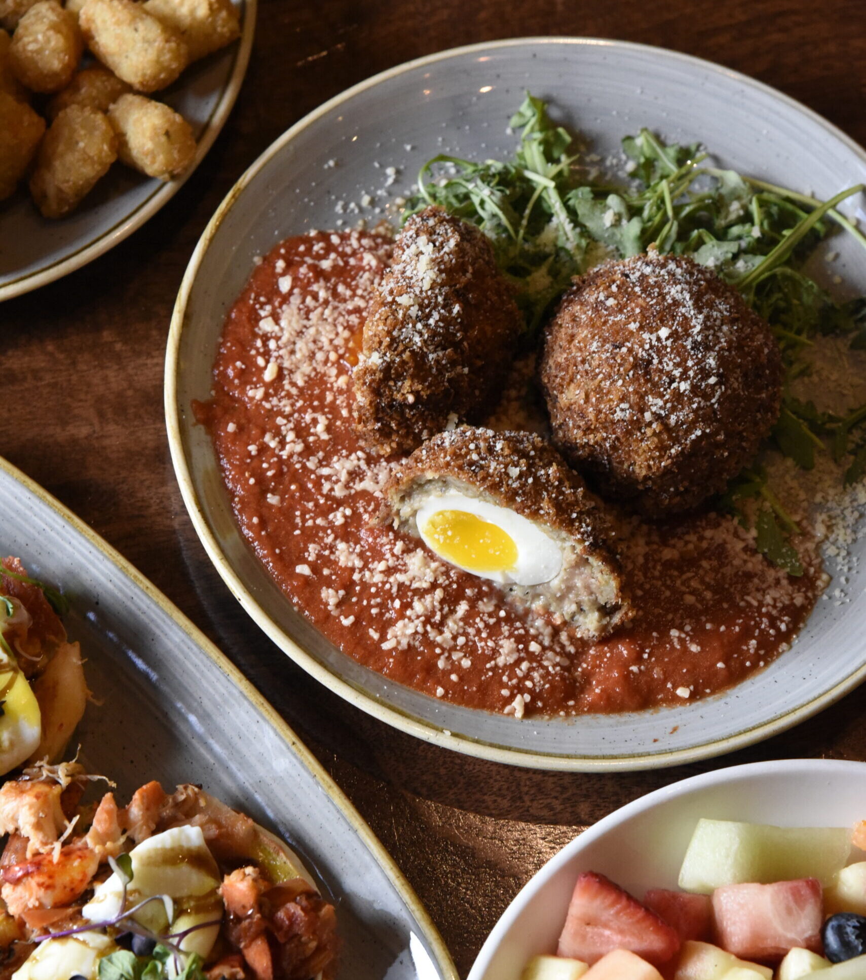 hard boiled eggs, salerno family meatball mix, parmesan panko, arugula, marinara