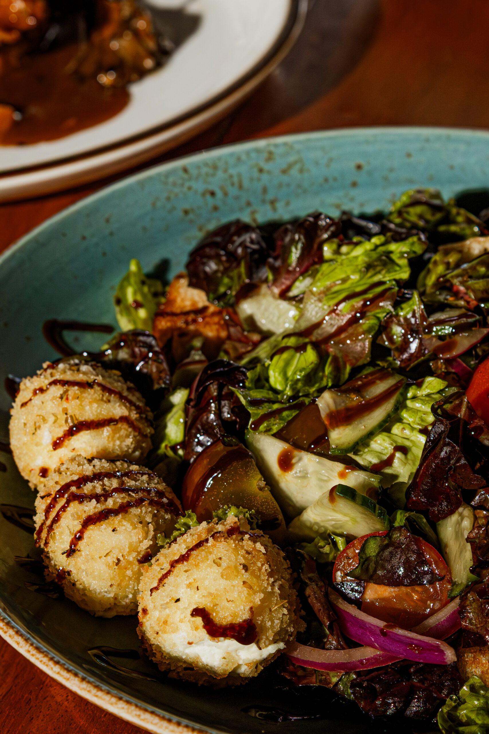 hydro red bibb, tuscan crouton, tomato, onion, cucumber, crusted goat cheese, balsamic vinaigrette & glaze